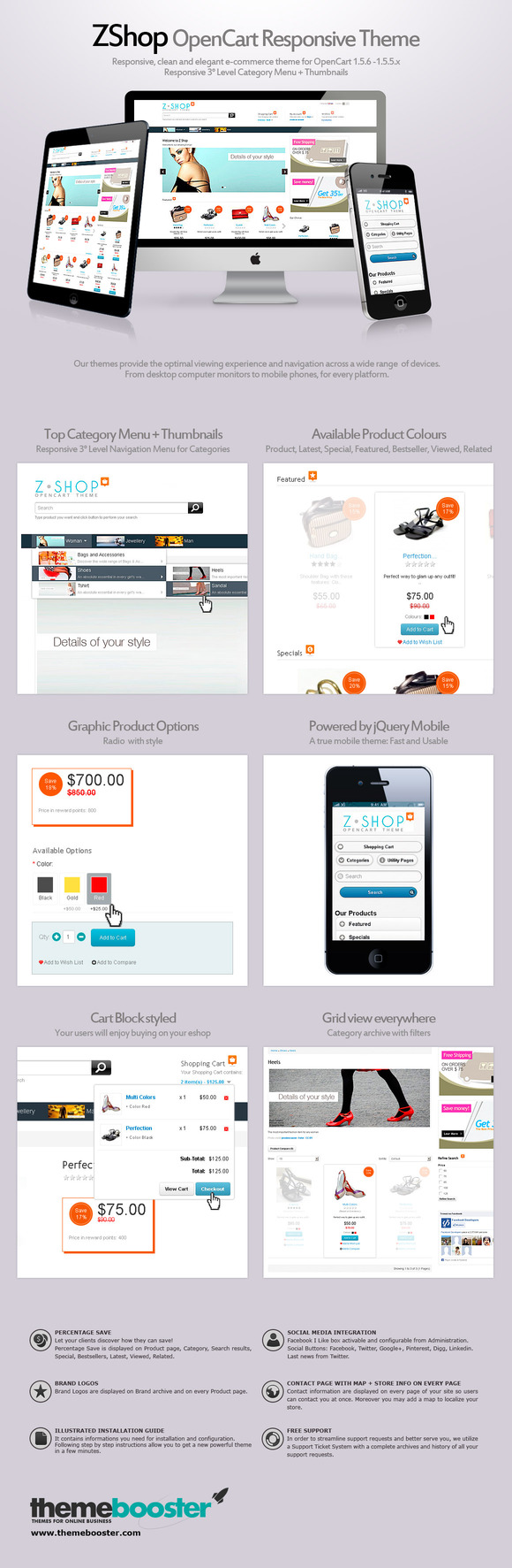 Based on Twitter Bootstrap and jQuery Mobile (for smartphone view), ZShop provides the optimal viewing experience and navigation across a wide range of devices.